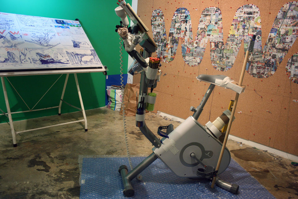 "WITH’s work, g-Part 1: Think-base Artefacts (2007), presents the process that led an advertising agency to win a spurious brief, concocted by the collective, to 'relaunch its brand of water'. WITH’s ironic ventriloquism of corporate ‘social responsibility,’ with its cool image, associated jargon and advertising techniques, seems to be targeting the blatant transformation of the ‘green cause’ into a fashionable and expensive, middle class product. The work would appear to address the problem of ‘soft’ or corrective environmentalism which advocates minute but accurate corrections in (middle class) consumer habits as a means to ‘correct’ environmental problems, neatly side-stepping the environmentalism which proposes radical, even if regressive, social change. Furthermore, the aesthetics of ‘process’ and bricolage deployed by the advertising campaign suggests that contemporary art’s interest in makeshift objects and assemblage may also be undergoing a parallel, market oriented appropriation." Nuno Rodrigues, 30 January 2008 Mute Magazine